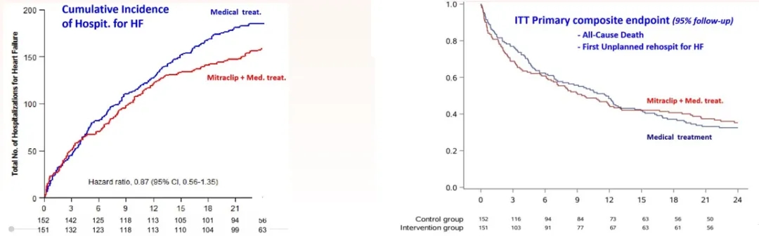 Mitra FR RCT研究共纳入304名患者将其按1:1比例随机分配为TEER+GDMT组和GDMT组,随访2年TEER+GDMT组患者心衰再住院率更低,但全因死亡率稍高。与COAPT RCT研究相比,Mitra FR RCT研究入组患者具备以下特点:1、标准药物治疗后仍有症状的患者(NYHA≥Ⅱ级);2、随机分组前12个月内至少有1次因心衰住院;3、有效反流口面积>20mm²或每搏反流量>30ml;4、15%<lvef<40%;5、不适合接受心脏科外科手术。< span="">