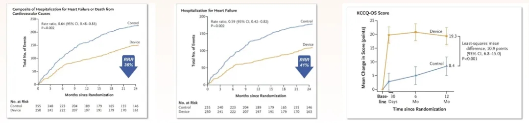 RESHAPE HF-2 RCT研究共纳入505名患者并按1:1比例随机分配为MitraClip G1-G3+GDMT组(器械组)和GDMT组(对照组),入组患者特点为反流程度相对较低、eGFR相对较高、NT-proBNP相对较低、MRA比例更高、β受体阻滞剂比例更高。结果发现,MitraClip TEER能显著改善心衰住院与生活质量,器械相关不良事件仅有4例(1.6%,2例血肿、1例心包积液和1例右心房穿孔)。
