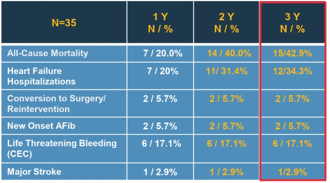 GeminiOne治疗DMR 1年随访结果:1年时3.1%患者全因死亡、2.3%患者接受再介入、1.5%患者发生SLDA、2.3%患者发生中风、1.5%患者发生主要出血事件,96.12%患者MR≤2+,95.45%患者NYHA≤Ⅱ级。