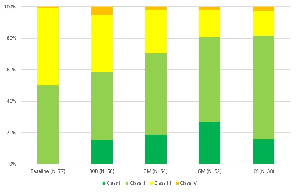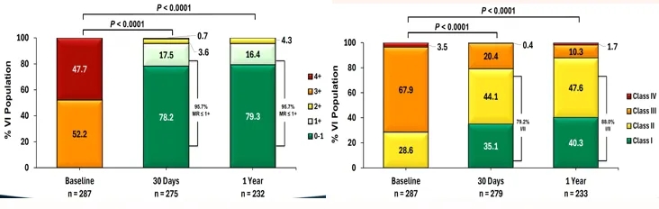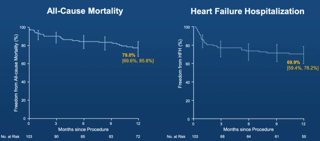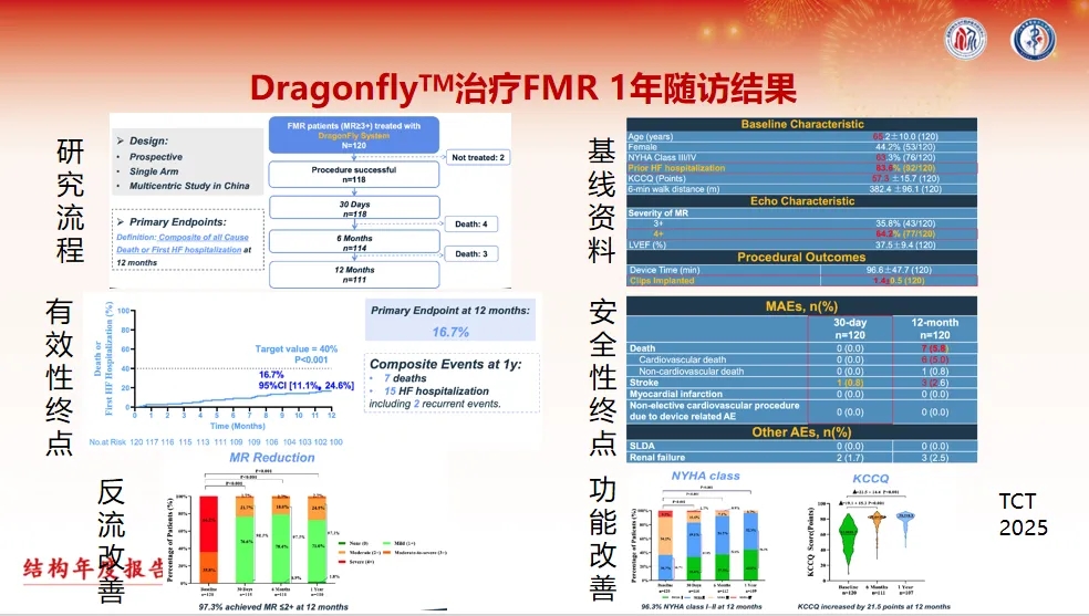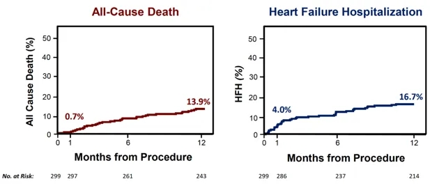 Dragonfly治疗FMR 1年随访结果:1年时16.7%患者发生全因死亡或首次心衰住院,97.3%患者MR≤2+,共7名患者死亡、15名患者心衰再住院,96.3%患者NYHA≤Ⅱ级。