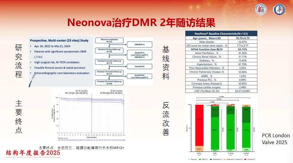Neonova治疗DMR 2年随访结果:2年时87.8%患者没有发生主要临床终点事件(全因死亡、瓣膜功能障碍行手术和MR>2+),95.4%患者MR≤2+。