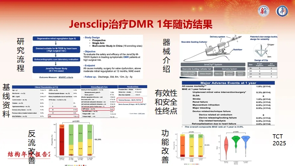 Jensclip治疗DMR 1年随访结果:1年时1.8%患者全因死亡、1.8%患者发生中风、0.9%患者发生主要出血事件、5.3%患者接受再介入或外科治疗,没有患者发生SLDA和空气栓塞;96.29%患者MR≤2+,93.46%患者NYHA≤Ⅱ级。