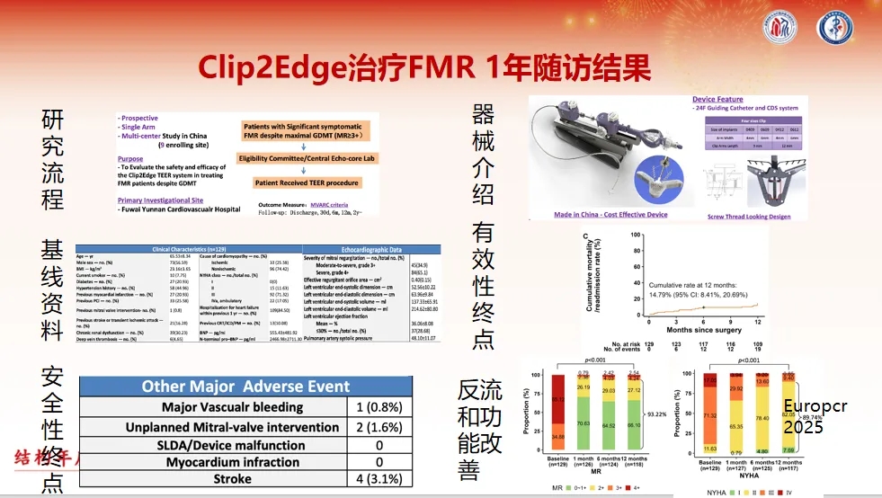 Clip2Edge治疗FMR 1年随访结果:0.8%患者发生主要出血事件、1.6%患者进行再介入、3.1%患者发生中风,没有患者发生SLDA,93.22%患者MR≤2+,89.74%患者NYHA≤Ⅱ级。