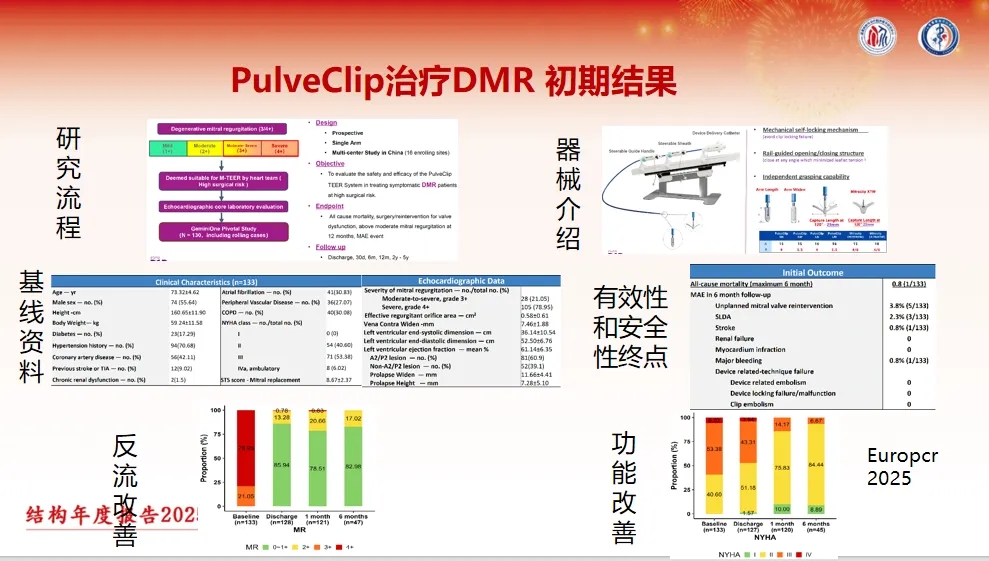 PulveClip治疗DMR初期结果:6个月时0.8%患者全因死亡、3.8%患者接受再介入、2.3%患者发生SLDA、0.8%患者发生中风、0.8%患者发生主要出血事件,所有患者MR≤2+,93.33%患者NYHA≤Ⅱ级。