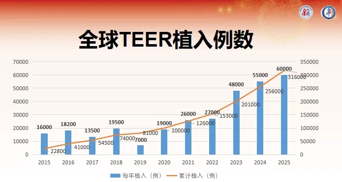2025年中国TEER植入例数4334例,共累计植入例数8659例,其中2025年中国MitraClip植入例数1830例,共累计植入例数5191例。在国产M-TEER器械发展方面,2023年中国首款国产经心尖TEER器械捍宇ValveClamp获批NMPA、中国首款国产经股静脉TEER器械德晋DragonFly获批NMPA,2025年中国首款国产弹性自锁TEER器械端佑Neonova获批NMPA。此外,用于指导M-TEER钳夹策略制定的新型交界区二尖瓣反流形态学分型正式公布,并提出相应的标准化操作流程。
