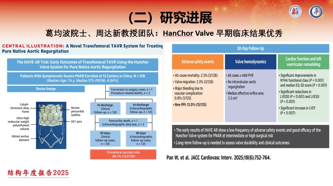 在新型瓣膜系统的临床研究方面,葛均波院士、周达新教授团队牵头开展的多中心HAVE AR试验显示,HanChor Valve系统治疗重度单纯性主动脉瓣反流早期效果良好,术后30天器械成功率达96.1%,主要安全性事件发生率低,患者心功能与生活质量显著改善。