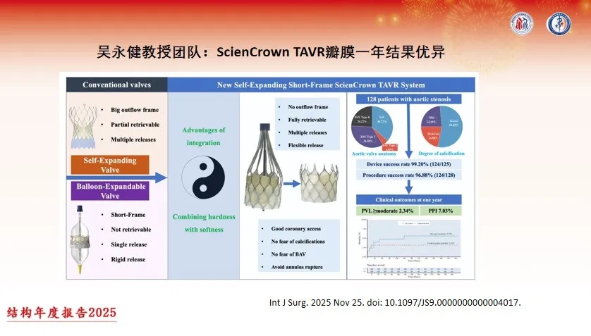 吴永健教授团队针对ScienCrown可回收自膨式短瓣架系统的研究也显示,治疗严重主动脉瓣狭窄的1年全因死亡率仅为5.47%,装置成功率高达99.20%。