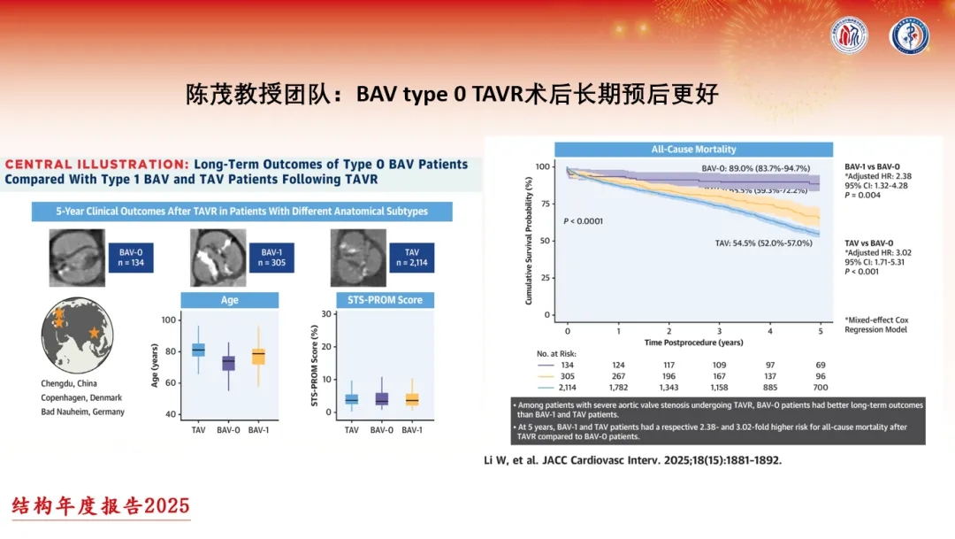 在特定解剖结构与长期预后方面,陈茂教授团队的国际回顾性队列研究显示,二叶式主动脉瓣的解剖亚型是影响TAVR术后长期死亡率的重要因素,且BAV患者使用球囊扩张瓣膜的5年死亡率高于自膨式瓣膜。