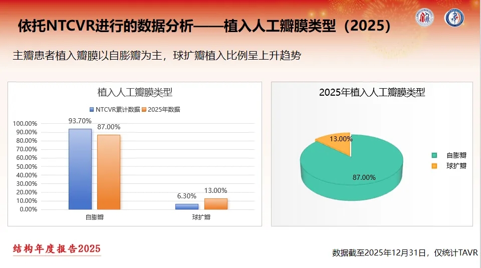 自膨瓣仍是目前临床应用最主流的选择,占比高达87%。值得注意的是,球扩瓣的植入比例正在持续上升,由NTCVR累计数据中的6.3%增长至2025年度的13%,显示出其临床应用接受度与份额的显著提升。