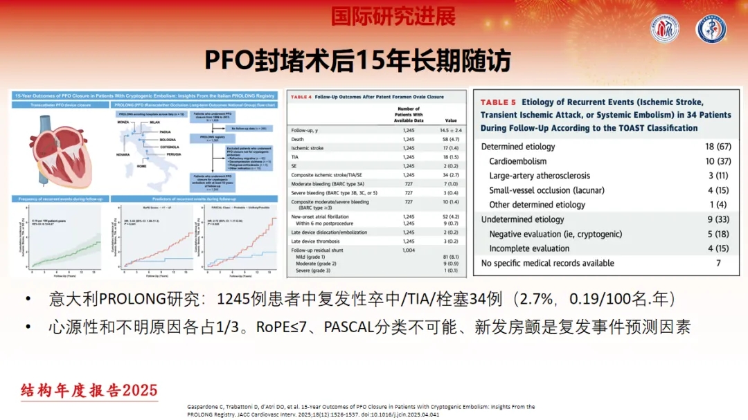 在PFO国际研究进展方面,PROLONG研究对1245例行PFO封堵治疗的患者进行了长达15年的随访,发现34例(2.7%)患者出现复发性卒中/短暂性脑缺血(TIA)/栓塞,心源性和不明原因各占1/3。RoPE评分≤7、PASCAL分类不可能、新发房颤是复发事件的预测因素。