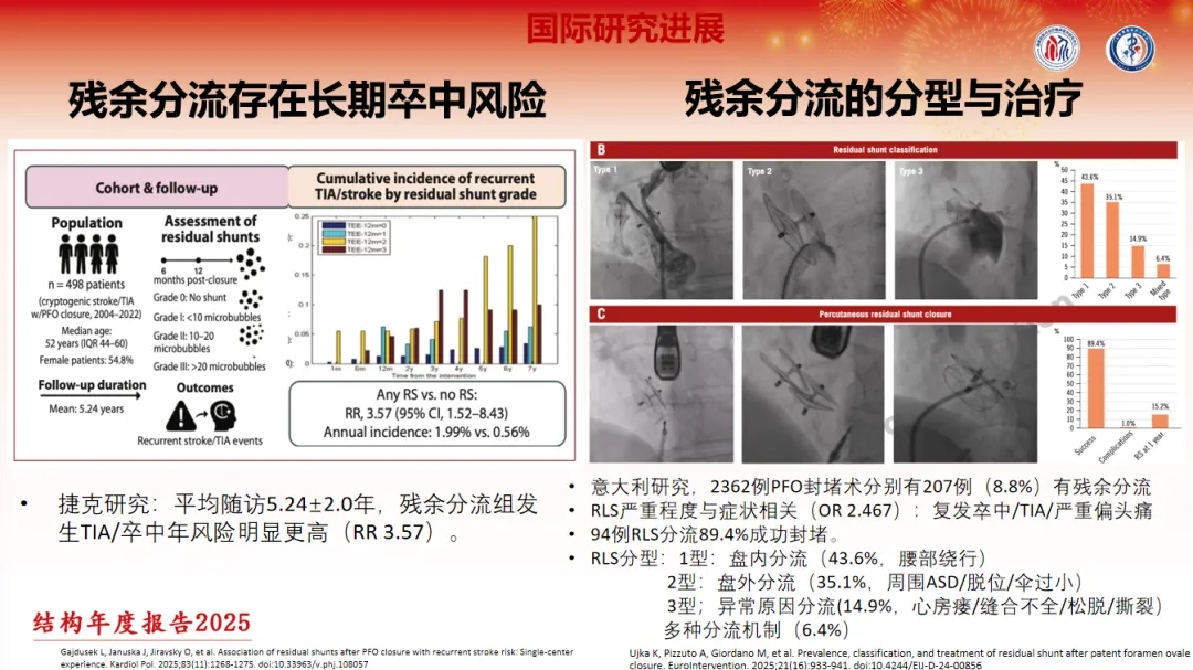还有两项研究关注了PFO封堵术后残余分流的风险、分型与治疗: