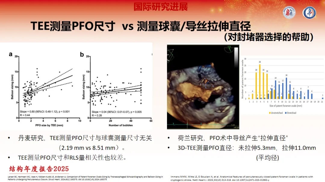 PFO解剖结构复杂,术前评估其尺寸具有一定难度。为准确评估PFO尺寸,学界展开了诸多研究。其中,来自丹麦的一项研究发现,TEE测量的PFO缺损尺寸及分流尺寸,与球囊测量值相关性较差;一项来自荷兰的研究发现,PFO术中导丝拉伸的方法测出的尺寸与TEE测量的尺寸也不具备相关性。这些研究结果对封堵器的选择起到了一定的帮助作用。