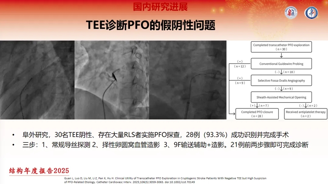 另外,来自中国医学科学院阜外医院的一项研究关注了TEE诊断PFO的假阴性问题。研究对30名TEE阴性、存在大量RLS者实施PFO探查,28例(93.3%)成功识别PFO并完成手术。研究中的探查术主要分为三步:1)常规导丝探测;2)选择性卵圆窝血管造影;3)9F输送辅助+造影,21例患者在前两步骤即可完成诊断。