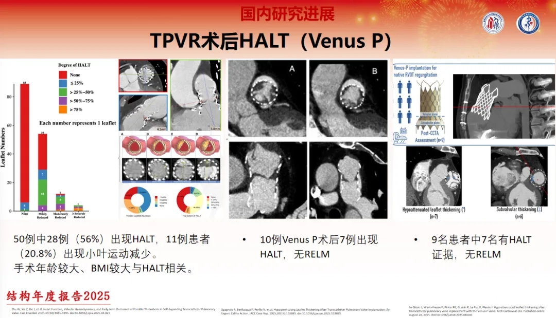 在一项以Venus P瓣膜进行TPVR的研究中,50例患者中有28例(56%)出现HALT,11例患者(20.8%)出现小叶运动减少。手术年龄较大、BMI较大与HALT相关。在另一项研究中,10例植入Venus P瓣膜的患者中有7例出现HALT,无RELM。还有研究发现,在9名植入Venus P瓣膜的患者中,7名有HALT证据,无RELM。