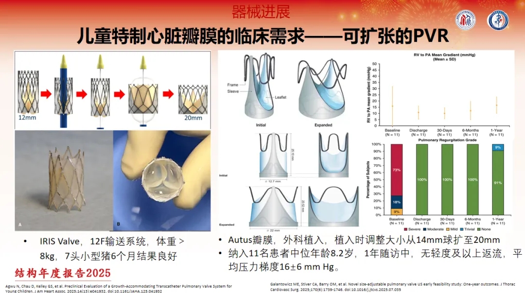 对于体重8-10 kg的患儿,及时处理进行性肺动脉瓣反流对避免右心室功能受损至关重要。然而,目前主流的TPVR器械多适用于体重≥20 kg的患者,低体重患儿不得不推迟瓣膜置换治疗,进而面临右心室扩张的风险。基于此,研发专为低体重幼儿设计、可适应生长发育的特制心脏瓣膜十分必要,且目前已初见曙光: