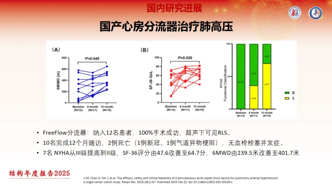 FreeFlow分流器治疗肺动脉高压的研究共纳入12例患者,所有患者均顺利完成手术。其中10例患者完成术后12个月随访,2例患者死亡(1例新冠、1例气道异物梗阻),无血栓栓塞并发症发生。7名患者NYHA从III级提高到II级。与基线相比,患者术后12个月的SF-36评分及6MWD均显著改善(SF-36评分由47.6改善至64.7分,6MWD由239.5米改善至401.7米)。