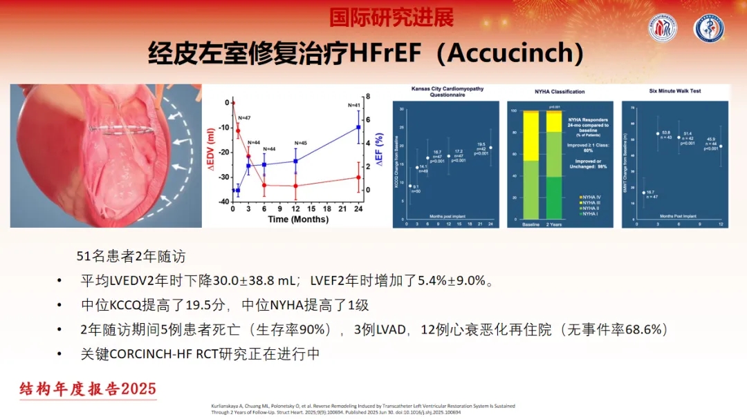 Accucinch研究对51名患者进行2年随访发现,患者平均LVEDV 2年时下降了30.0±38.8 mL;LVEF 2年时增加了5.4%±9.0%;中位KCCQ提高了19.5分,中位NYHA提高了1级。2年随访期间共5例患者死亡(生存率90%),3例LVAD,12例心衰恶化再住院(无事件率68.6%)。关于该技术的关键CORCINCH-HF RCT研究正在进行中,期待结果的发布。
