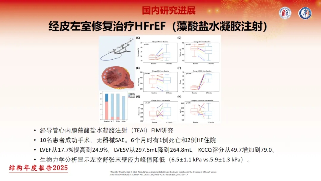 经导管心内膜海藻酸盐水凝胶注射治疗心力衰竭的首个人体临床试验共纳入10例患者,所有患者均顺利完成手术,无器械相关SAE。术后6个月随访期间,共出现1例死亡病例及2例心力衰竭住院病例。术后6个月时,患者LVEF由基线的17.7%提高到24.9%;LVESV从297.5mL降到264.8mL,KCCQ评分从49.7增加到79.0。心脏生物力学分析显示,患者左心室舒张末期室壁峰值应力显著降低,由6.5±1.1 kPa降至5.9±1.3 kPa。