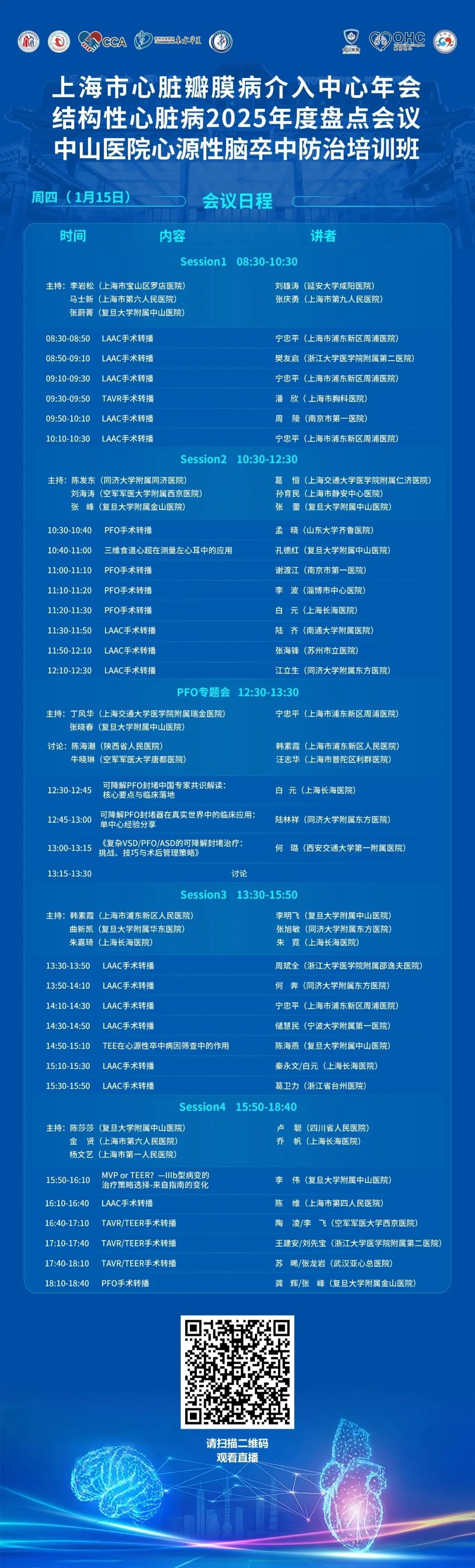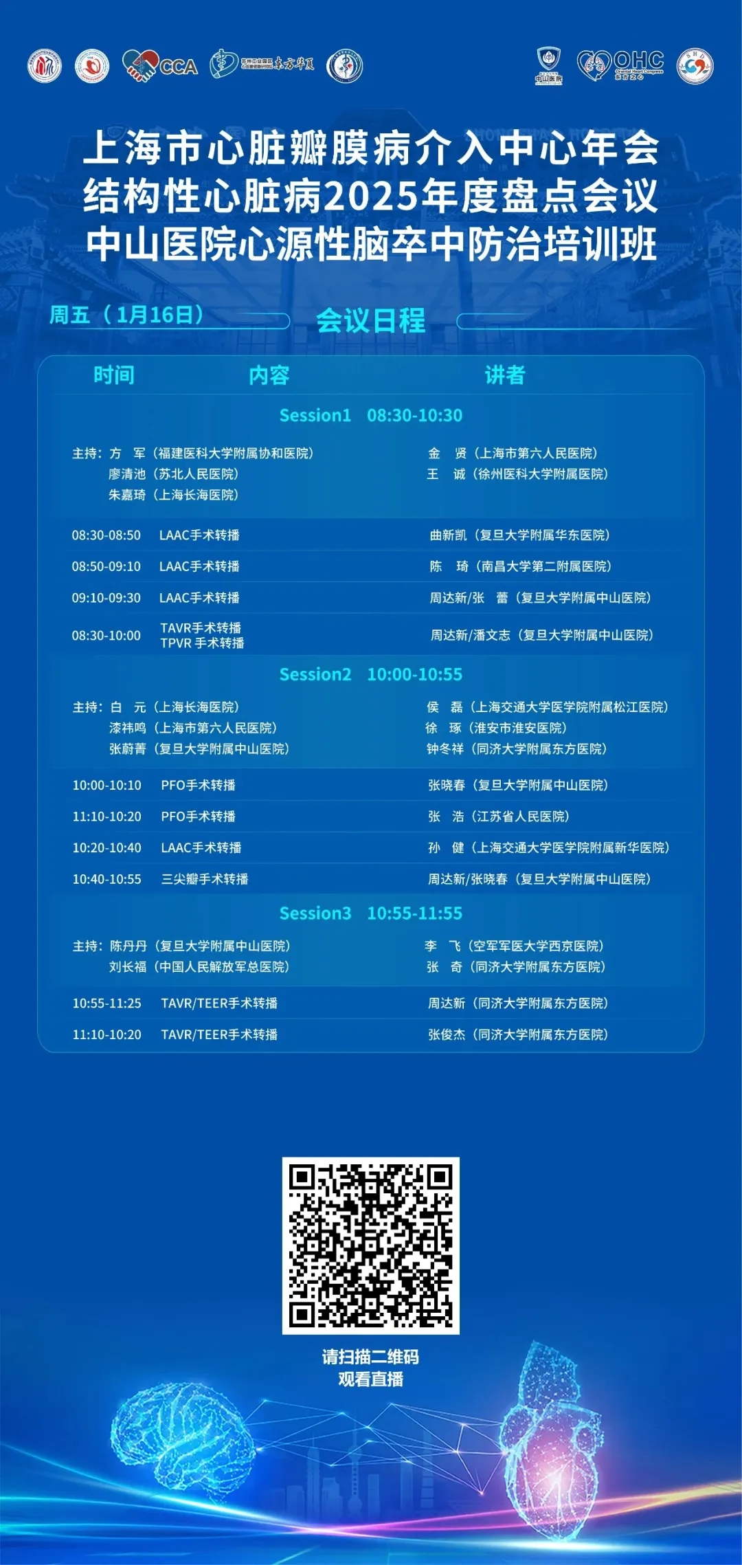 会议预告 | 上海市心脏瓣膜病介入中心年会、结构性心脏病2025年度盘点会议、中山医院心源性脑卒中防治培训班明日启动! 2026-01-13 21:40:00 浏览量:4018 线上日程全览 扫码查看大会微官网 · END · 专业的心血管医生学术交流平台 医谱APP 点击下载 医谱学术 点击关注 版权及免责声明: 本网站所发表内容知识产权归属医谱平台、主办方以及原作者等相关权利人,未经许可,禁止进行复制、传播、展示、镜像、转载、摘编等。经授权使用,须注明来源,否则将追究其法律责任。有关作品内容、版权和其他问题请与本网联系