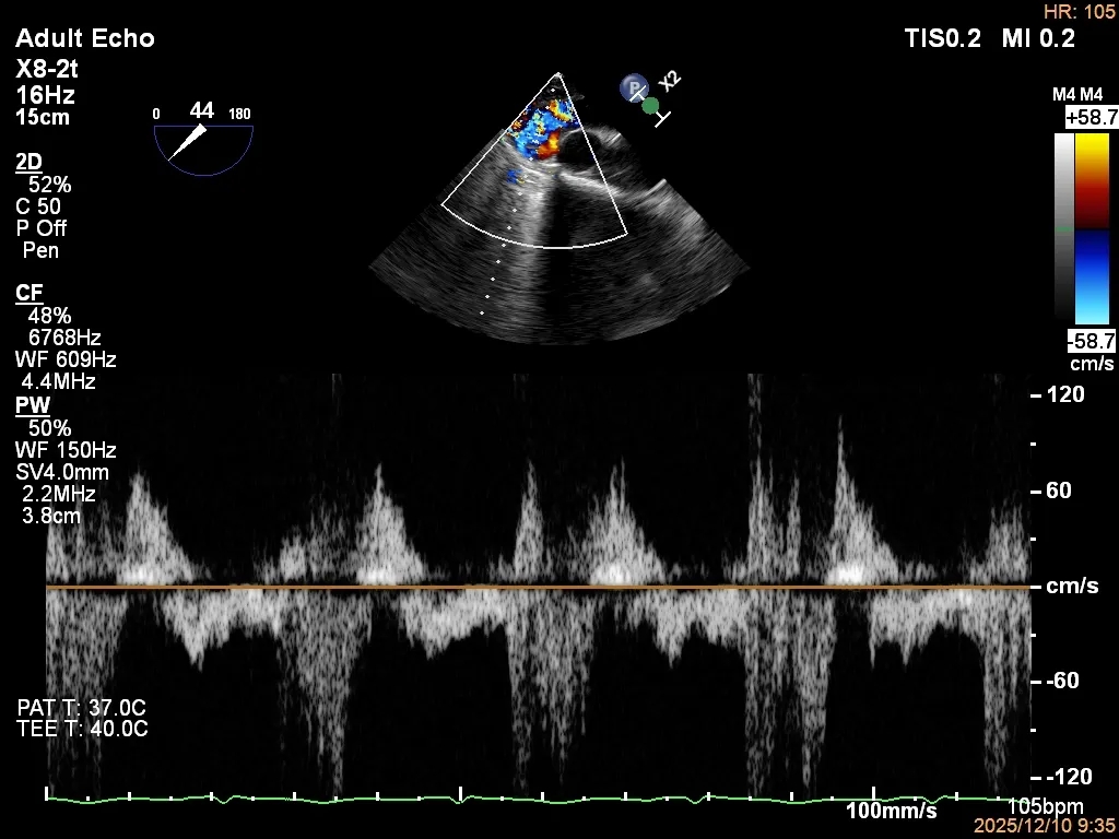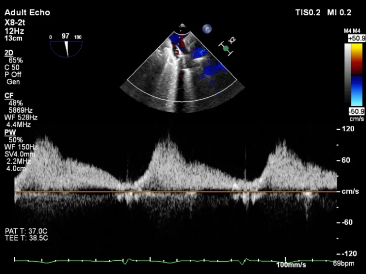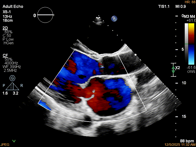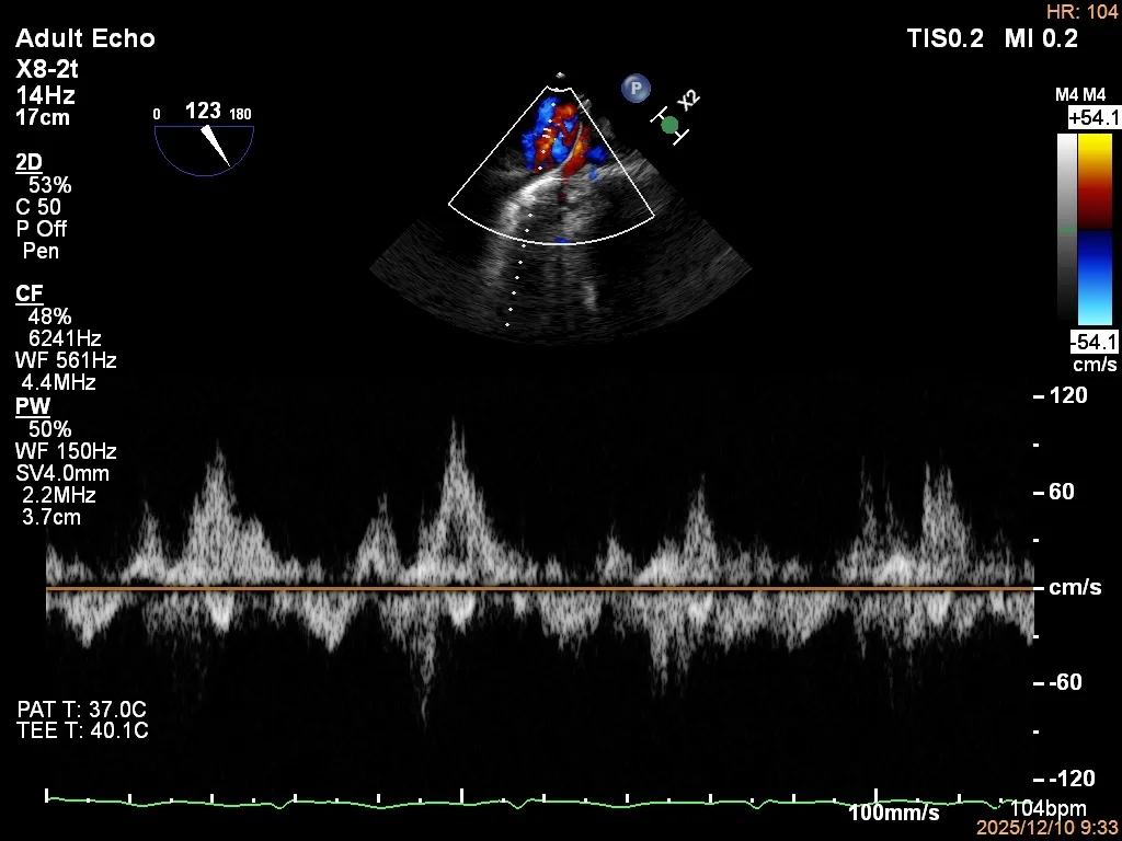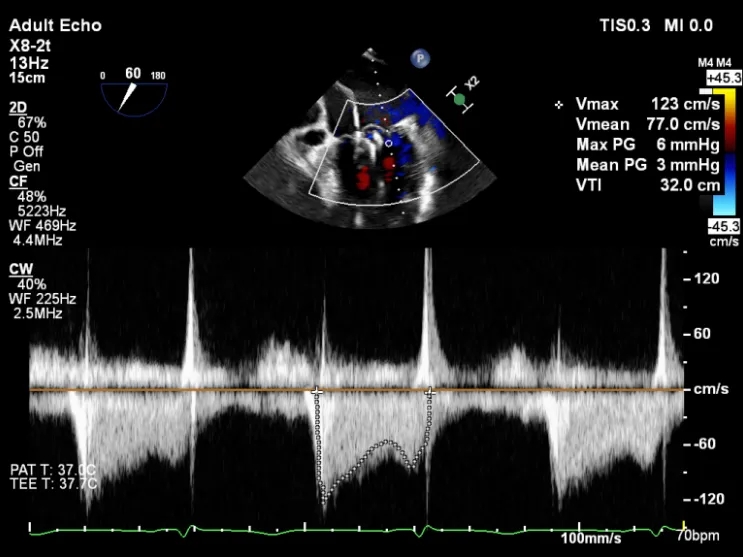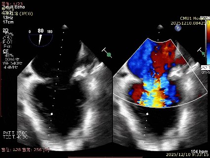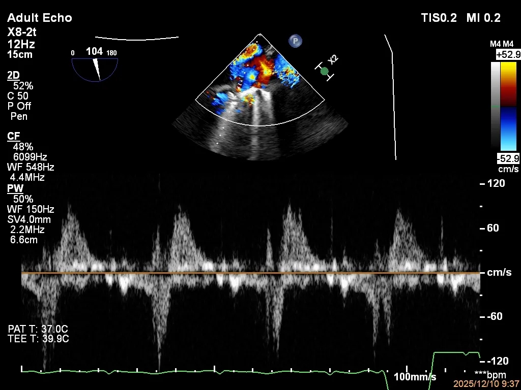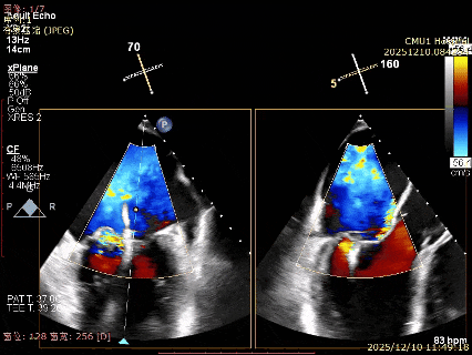 反流程度:极重度(5+),PISA法估测EROA约1.12cm²,R-VOL约98ml;