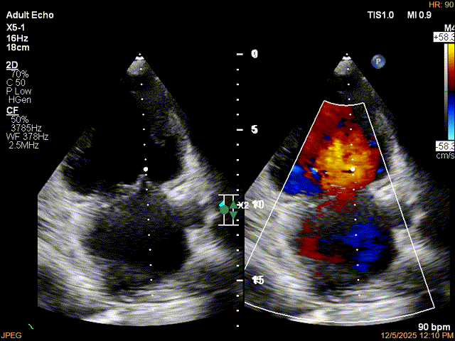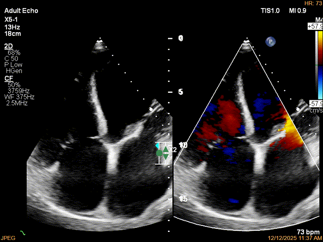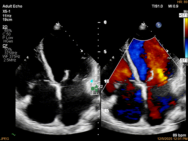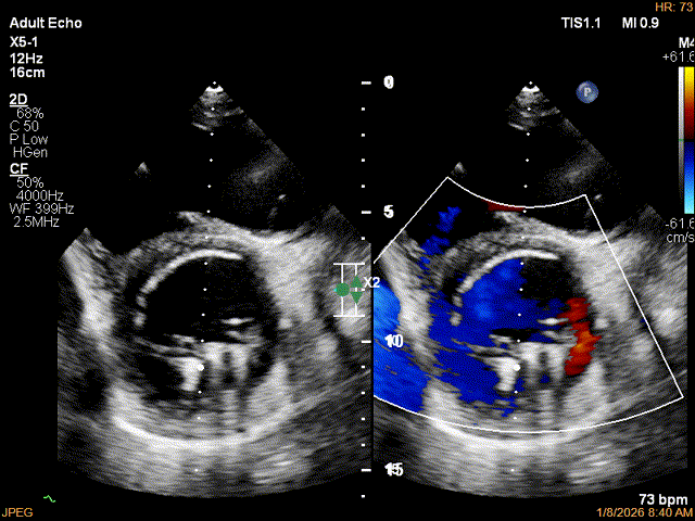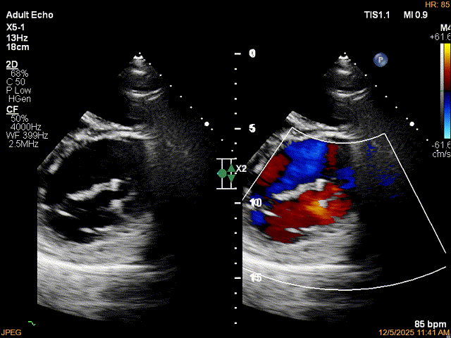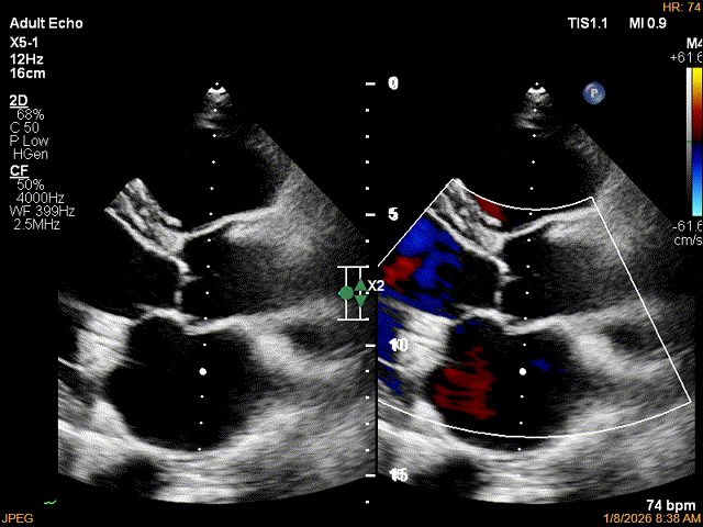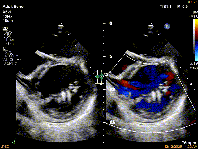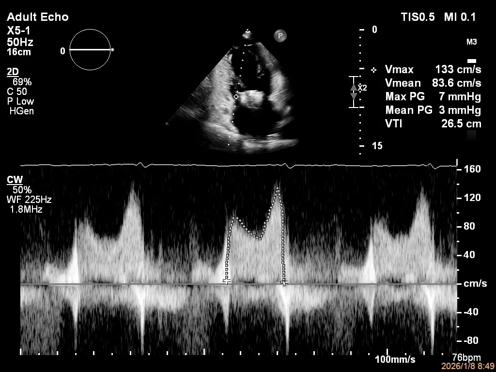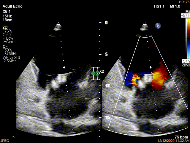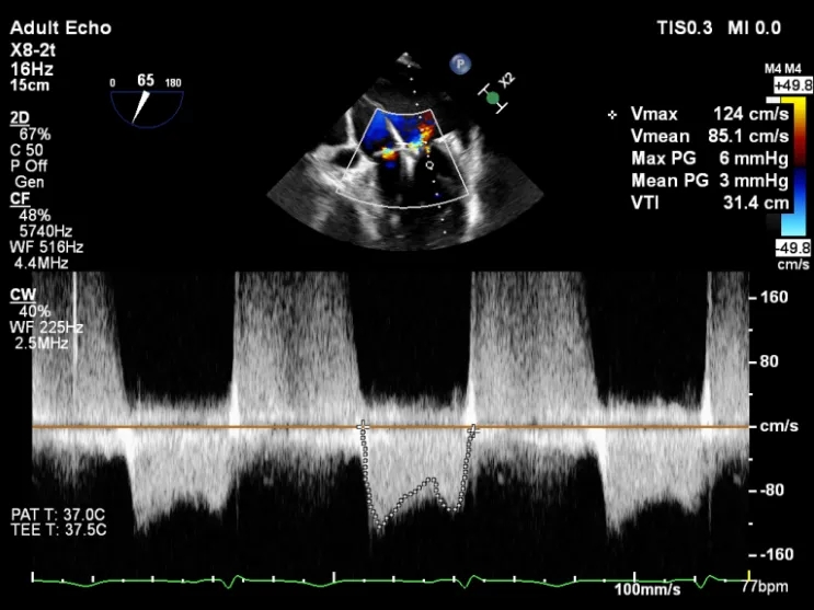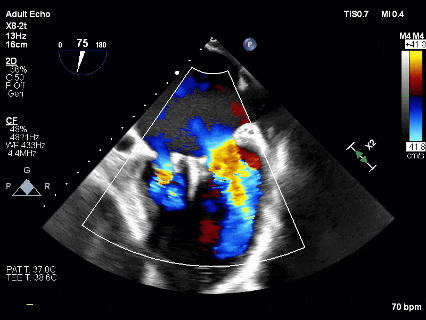 反流程度:极重度(5+),PISA法估测EROA约1.12cm²,R-VOL约98ml;