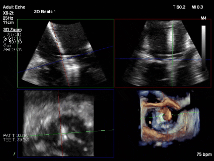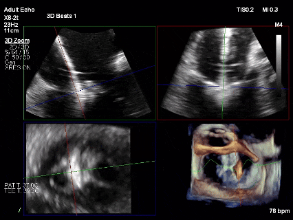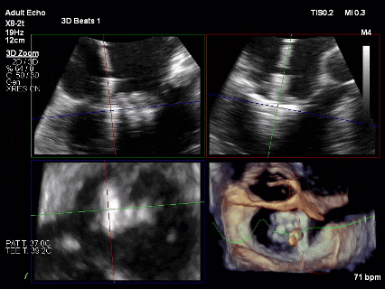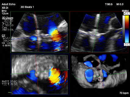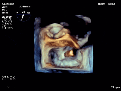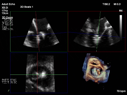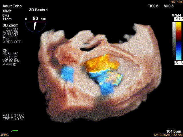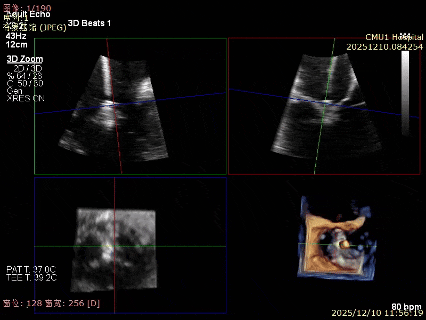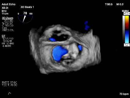 最终结果3D-Zoom-color显示组织桥稳定,原脱垂区域前后叶对合部分的脱垂已消除,反流降至1+以下