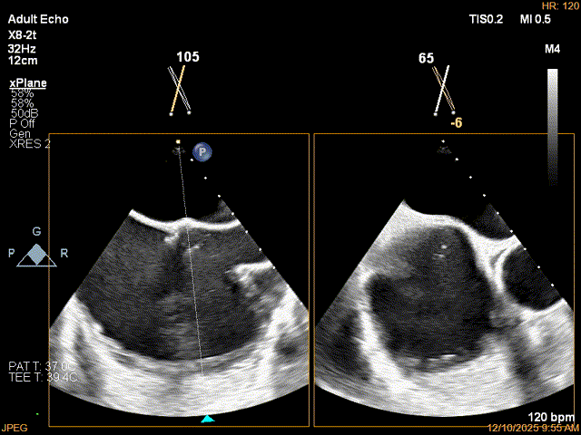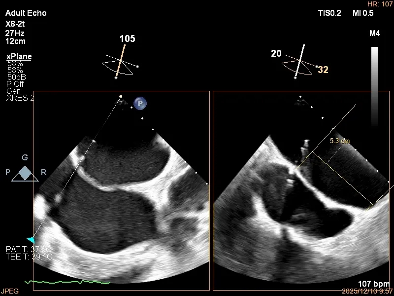 术前即刻TEE进一步明确了二尖瓣反流的机制(DMR)及反流程度(5+),重点完善了病变区域二尖瓣解剖结构的评估,预估手术难点/影响手术效果的解剖结构为冗长的二尖瓣后叶(PML约25mm),宽大的脱垂(Flail Width约30mm),超大的连枷间距(Flail gap约14mm)。