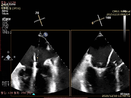 全麻下穿刺右股静脉,在TEE指导下完成房间隔穿刺,穿刺处与二尖瓣环距离5.3cm。将Superstiff导丝送至左房,应用18F鞘管扩张穿刺部位,沿导丝将可操纵导引导管送入左房。