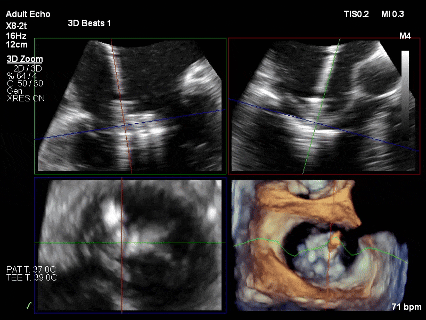3D-TEE二尖瓣相关解剖学参数:后叶长度:22-25mm,前叶长度:31-34mm;瓣环AP径:47mm,ML径:48mm;瓣口面积:约7.8cm²;脱垂宽度:30mm,最大连枷间距:14mm。