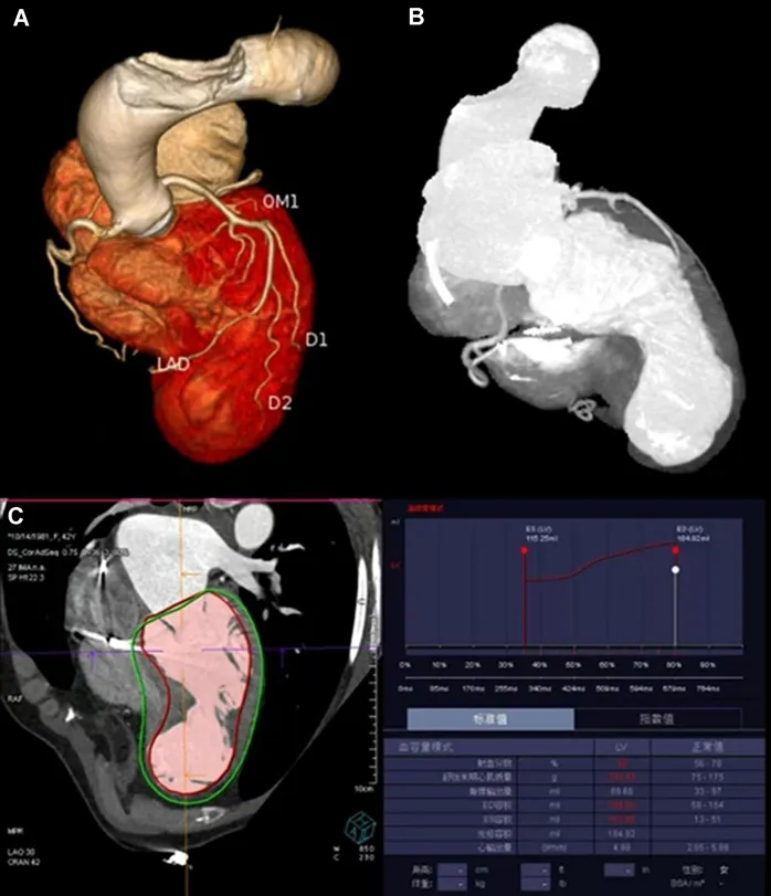 图注:(A及B)心尖前壁可见巨大解剖性室壁瘤。(C)左心室舒张末期容积为184 mL,收缩末期容积为119 mL,射血分数为38%。