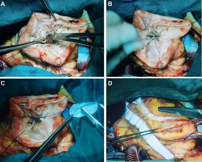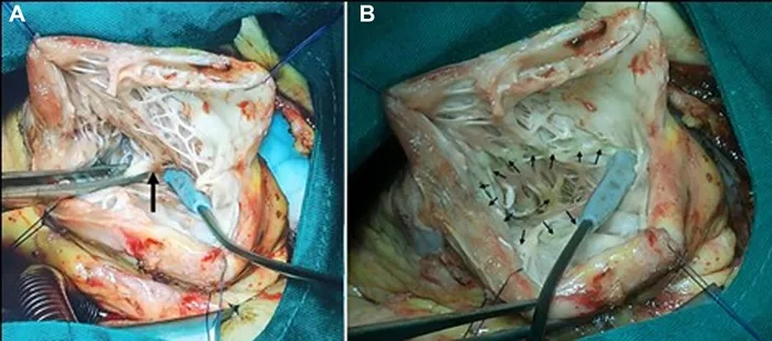 开放主动脉阻断钳后,经食管超声心动图提示重度二尖瓣反流,遂改为双腔静脉插管恢复体外循环,再次阻断升主动脉并灌注HTK心脏停搏液。经右心房及房间隔入路,切除二尖瓣前叶(保留后瓣装置),植入26mm机械二尖瓣。心脏复跳后,患者顺利脱离体外循环,常规关胸。