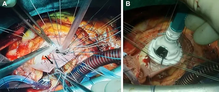图注:(A)Y型切口延伸至双侧纤维三角,以牛心包补片扩大瓣环至22mm(箭头所示)。(B)随后植入20mm机械主动脉瓣