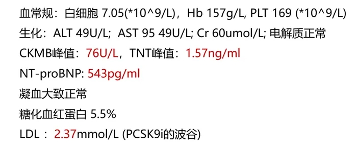患者青年男性,慢性病程急性加重,胸闷再发10小时。既往陈旧性心肌梗死、复合杂合子型家族性高胆固醇血症11年。颈动脉斑块7年。关节黄色瘤术后16年。入院查体生命体征平稳,双肺听诊未及啰音,心界不大、律齐、各瓣膜区未及杂音。