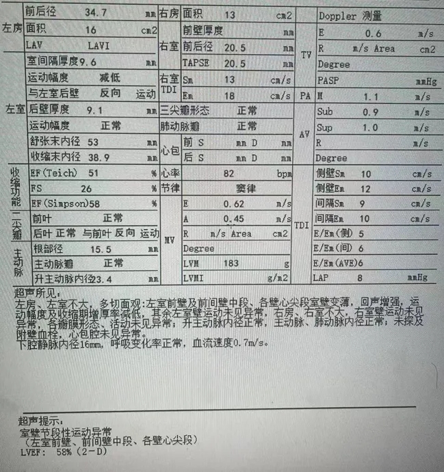 依据辅助检查:心电图V1~V4导联ST段抬高,心肌损伤标志物升高,CKMB:76U/L,TNT:1.57ng/ml,NT-proBNP:543pg/ml;超声心动图:前壁、前间壁、各壁心尖段节段性运动异常,本次心肌梗死诊断明确。冠脉造影显示LAD近段原支架入口处次全闭塞,遂于该处行血栓抽吸及经皮冠状动脉腔内血管成形术(PTCA)。