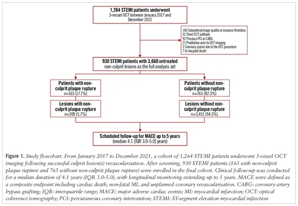 该研究在2017年1月至2021年12月期间,于哈尔滨医科大学附属第二医院进行,共纳入1264例接受三支主要心外膜冠状动脉OCT成像的ST段抬高型心肌梗死(STEMI)患者(≥18岁)。排除OCT成像质量欠佳(n=160)、OCT回撤距离短(n=52)、既往接受过经皮冠状动脉介入治疗(PCI)或冠状动脉旁路移植术(CABG)(n=92)、OCT成像前进行过预扩张(n=21)、OCT操作导致冠状动脉痉挛(n=2)或院内死亡(n=7)的患者。最终纳入930例STEMI患者,共计3660处非罪犯病变。根据OCT识别的非罪犯部位斑块破裂情况对患者和病变进行分类。 STEMI 的诊断标准和传统危险因素,以及定量冠状动脉造影分析。所有患者均在出院后分别于术后1、3、6和12个月进行随访,之后每年随访一次,随访方式为医院访视或电话随访。主要不良心脏事件(MACE)包括心脏性死亡、非致命性心肌梗死和非计划性缺血驱动的血运重建(Figure1)。