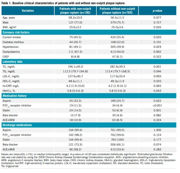 2017年1月至2021年12月期间,共纳入930例ST段抬高型心肌梗死(STEMI)患者,其中165例(17.7%)发生非罪犯斑块破裂。所有患者的平均年龄为56.8岁,男性占75.9%。与未发生非罪犯斑块破裂的患者相比,发生非罪犯斑块破裂的患者体重指数(BMI)更高,吸烟者比例更低,高血压患病率更高。此外,发生非罪犯斑块破裂的患者血脂水平也更高。例如,血脂异常的患病率以及总胆固醇和低密度脂蛋白胆固醇水平在发生非罪犯斑块破裂的患者中均较高(Table1)。