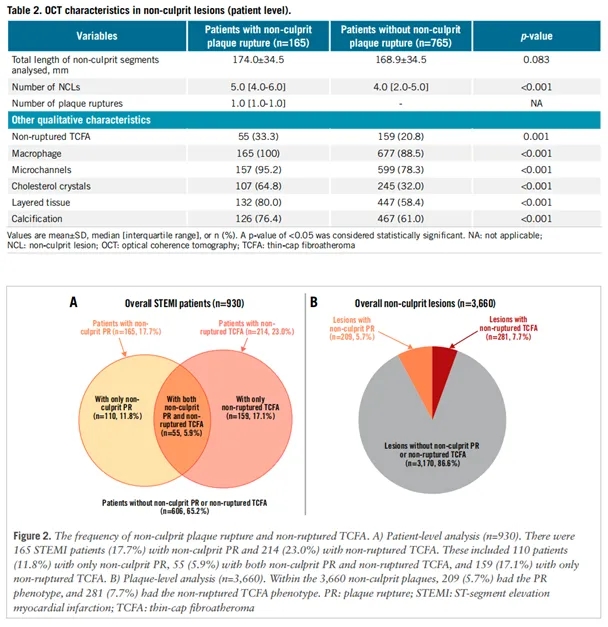 在非罪犯冠状动脉中,薄帽纤维粥样斑块(TCFA)的存在与STEMI患者发病和不良临床结局均独立相关。非罪犯血管斑块破裂的患者长期不良临床事件风险高。