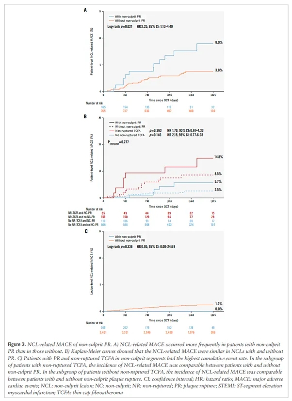 然而,目前尚缺乏关于非罪犯斑块破裂长期预后价值的研究。此外,在冠状动脉粥样硬化过程中,薄帽纤维粥样斑块(TCFA)被认为是斑块破裂的前兆病变。TCFA与斑块破裂的唯一区别在于,TCFA的纤维帽完整,而斑块破裂时纤维帽则被破坏。值得注意的是,OCT识别的非罪犯病变处的TCFA已被证实是长期不良事件的强预测因子。然而,哪种高危斑块表型(斑块破裂、未破裂的TCFA或两者兼有)对长期不良事件的贡献更大,目前尚不明确。为此,该研究旨在探讨非罪犯节段内的高危斑块表型在预测STEMI人群长期复发性不良心脏事件中的作用。该结果近期在EuroIntervention杂志上发表。