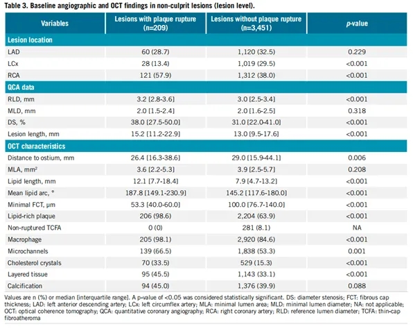共识别出3660处非罪犯病变,其中209处(5.7%)发生斑块破裂,281处(7.7%)被归类为未破裂的薄纤维帽动脉粥样硬化斑块(TCFA)。与未发生斑块破裂的非罪犯病变相比,发生斑块破裂的非罪犯病变更可能位于右冠状动脉(57.9% vs 38.0%;p<0.001),较少位于左回旋支(13.4% vs 29.5%;p<0.001),且更靠近冠状动脉开口(26.4 [IQR 16.3-38.6] mm vs 29.0 [IQR 15.9-44.1] mm;p=0.006)。此外,与未发生斑块破裂的病变相比,发生斑块破裂的病变表现出更严重的血管造影狭窄、更高的脂质含量、更薄的 FCT 和更多定性的 OCT 特征。在非罪犯病变中共发生35例可评估事件,包括10例非致命性心肌梗死(即靶血管心肌梗死)和25例非计划性血运重建(即靶病变血运重建)(Table3)。