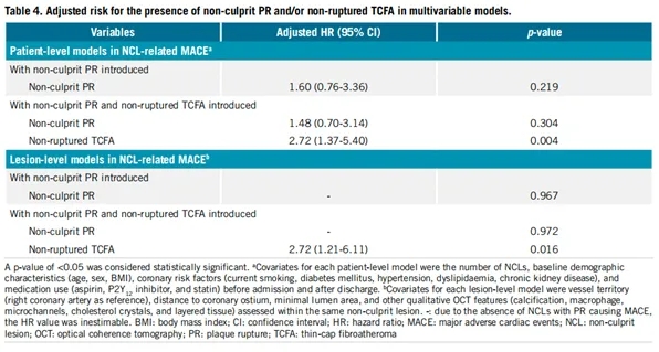 非罪犯斑块破裂与非罪犯病变相关MACE无显著相关性(HR 1.60,95% CI:0.76-3.36;p=0.219)。在校正未破裂的薄纤维帽动脉粥样硬化斑块(TCFA)后,发现非罪犯病变部位的未破裂TCFA(HR 2.72,95% CI:1.37-5.40;p=0.004)与非罪犯病变相关的主要不良心血管事件(MACE)显著相关,而斑块破裂(HR 1.48,95% CI:0.70-3.14;p=0.304)则无显著相关性(Table4)。