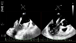 患者麻醉后取平卧位,经食管超声(TEE)探头置入到位。股静脉穿刺点消毒铺巾后进行穿刺,并置入鞘管建立工作路径。置入超声引导专用导丝(Panna Wire)和房间隔穿刺针。Panna Wire梭形头端在超声下具有优异的可视性与指向性,将其置入穿刺针内,可实时指导穿刺针的位置。在TEE实时引导下,完成房间隔穿刺。因左心房容积偏小,操作空间受限,故穿刺点选择略靠后,但操作过程顺利,未损伤左心房后壁。