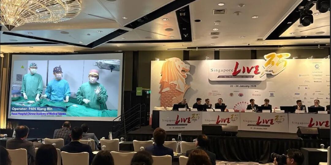 1月22日至24日,亚洲心脏介入领域年度顶级盛会——Singapore LIVE 2026(SingLIVE 2026)在新加坡隆重召开。会议期间,中国医学科学院阜外医院潘湘斌教授团队受邀向大会进行纯超声引导经导管二尖瓣缘对缘修复术(TEER)手术转播,凭借其创新性与高难度引发国际同行的广泛关注,成为本次会议的焦点。