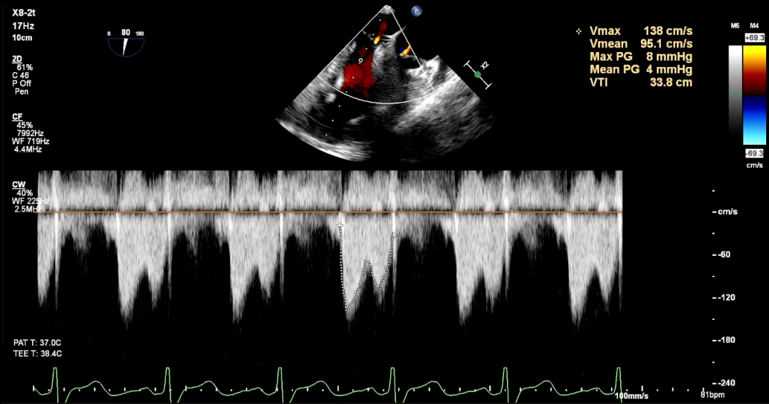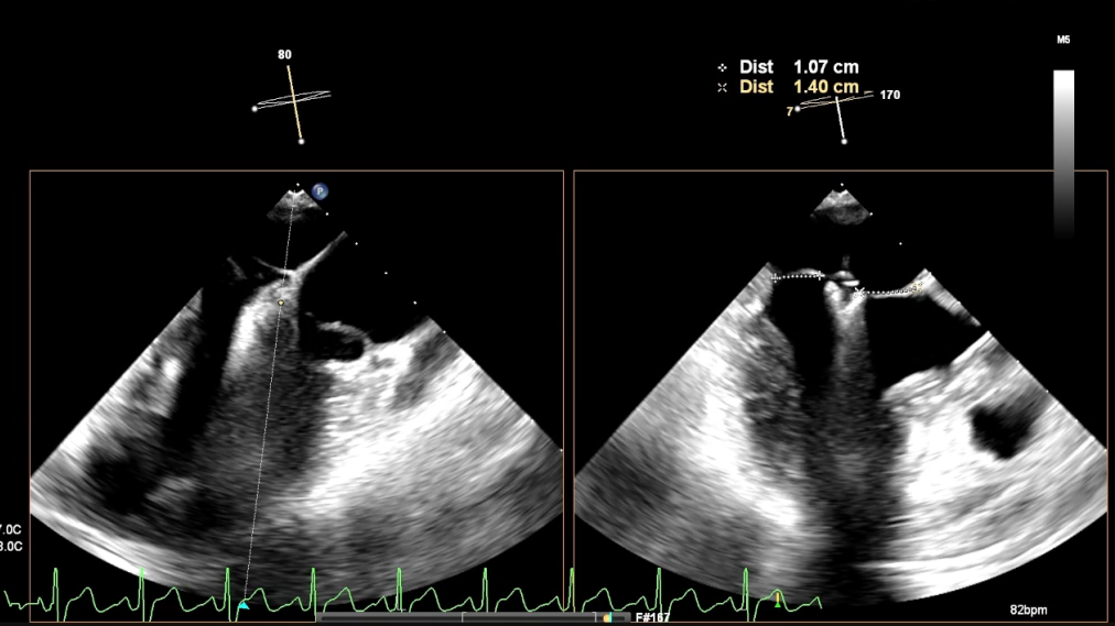 值得关注的是,首次夹合后,TEE评估显示,患者二尖瓣反流已从术前的4+大幅改善,有效反流口面积显著缩小,初步达到目标。但潘湘斌教授团队秉持“精益求精”的诊疗理念,并未止步于此。团队通过超声精准测量发现,首次夹合后跨瓣压差偏高,恐无法置入第二枚夹子。在充分权衡调整夹子可能带来的瓣叶损伤风险与彻底修复带来的长期获益后,潘湘斌教授团队果断决定:在超声团队的精准配合下,打开瓣膜夹小心调整位置,向后叶方向移动,以捕获更多瓣叶。这一决策既体现了对患者长期健康的责任担当,也彰显了中国团队在纯超声引导TEER技术领域的深厚积累与精准把控,最终通过一次优化调整,圆满解决了反流与脱垂问题,实现了“微创化、精准化”的治疗目标,赢得了国际专家的高度认可。