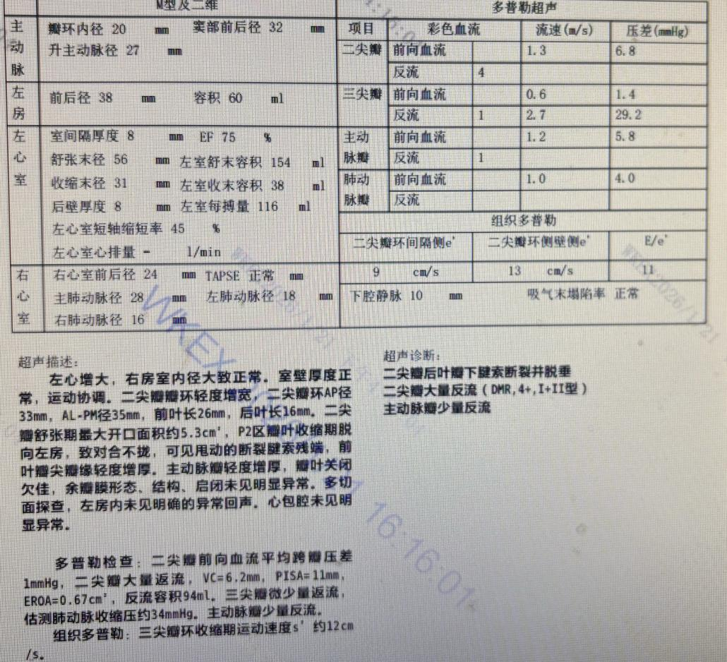 诊断:重度二尖瓣反流;二尖瓣后叶脱垂伴腱索断裂。