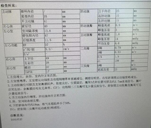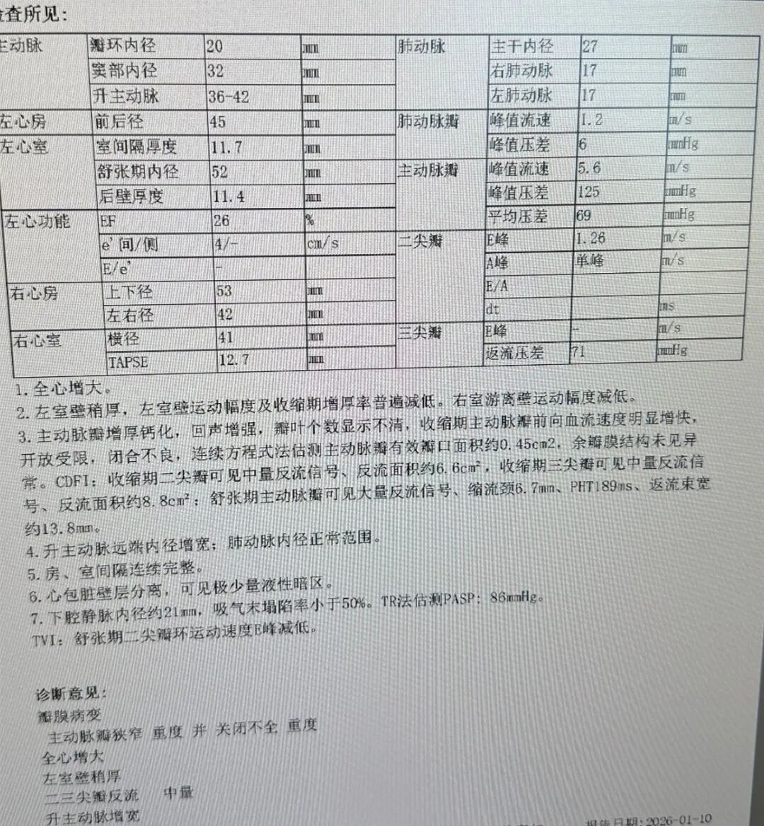 主动脉瓣峰值流速:5.6m/s;峰值压差:125mmHg;平均压差:69mmHg