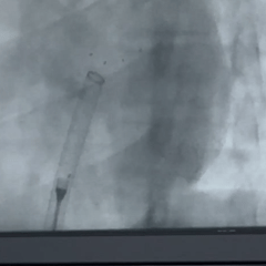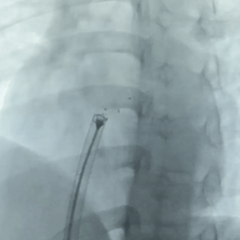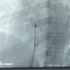 固定钢缆不动 ,后撤鞘管展开右盘,钢缆及鞘管轻轻前推,使右盘贴靠于房间隔上