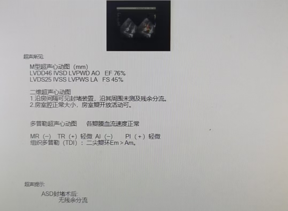 多普勒超声心动图:各瓣膜血流速度正常。ASD L→R(+);MR(-);TR(+),轻度2.8m/s;Al(-);PI(+),轻微。
