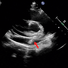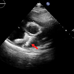 主动脉短轴切面下,封堵器呈Y字型抱住主动脉根部,夹持稳定