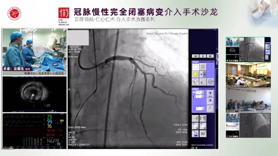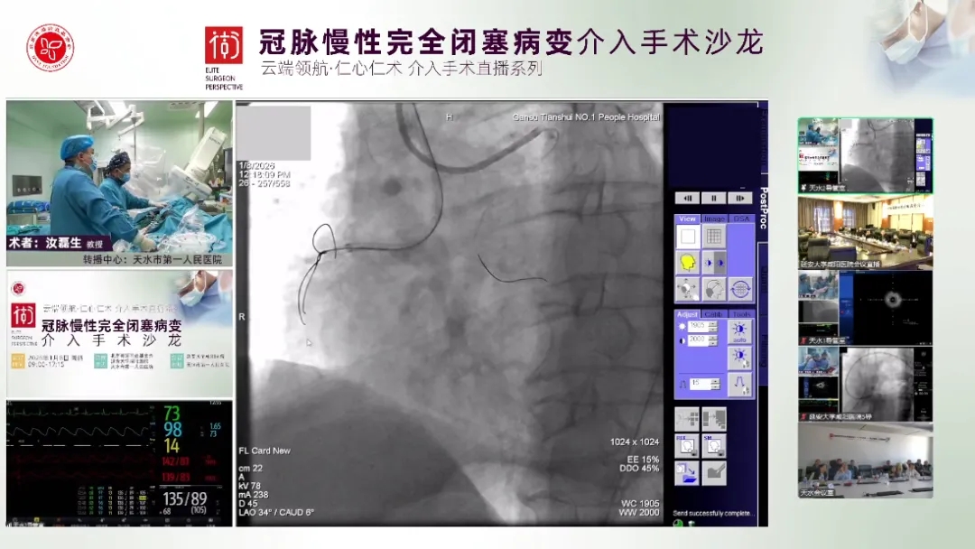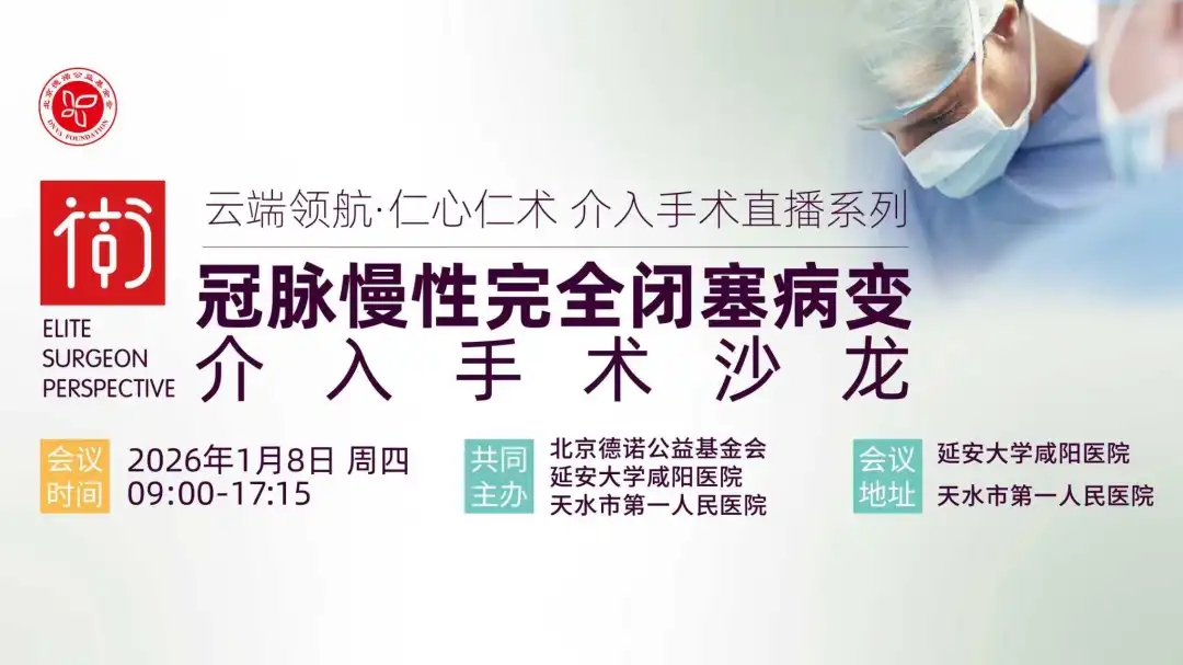 CTO是PCI领域公认的难点与高地,因其病变复杂,常伴有严重钙化及血管迂曲,对术者经验、器械选择及策略制定均有极高的要求。为破解这一临床难题、推动技术下沉,近日,由延安大学咸阳医院、天水市第一人民医院、北京德诺公益基金会共同主办的“云端领航・仁心仁术”介入手术直播系列——冠脉慢性完全闭塞病变介入手术沙龙成功举办。本次会议以线上直播+线下联动的形式,汇聚国内心血管介入领域顶尖专家与基层术者,通过8台高难度CTO-PCI手术实时直播、学术讲座等环节,为参会同道呈现了一场立足前沿、扎根实战的高水平学术盛宴。