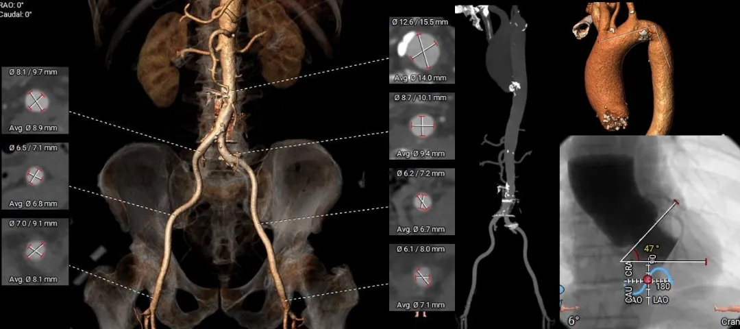 外周入路走形轻度迂曲,左右股动脉直径尚可,主动脉弓部、腹主动脉处见少量钙化附着;